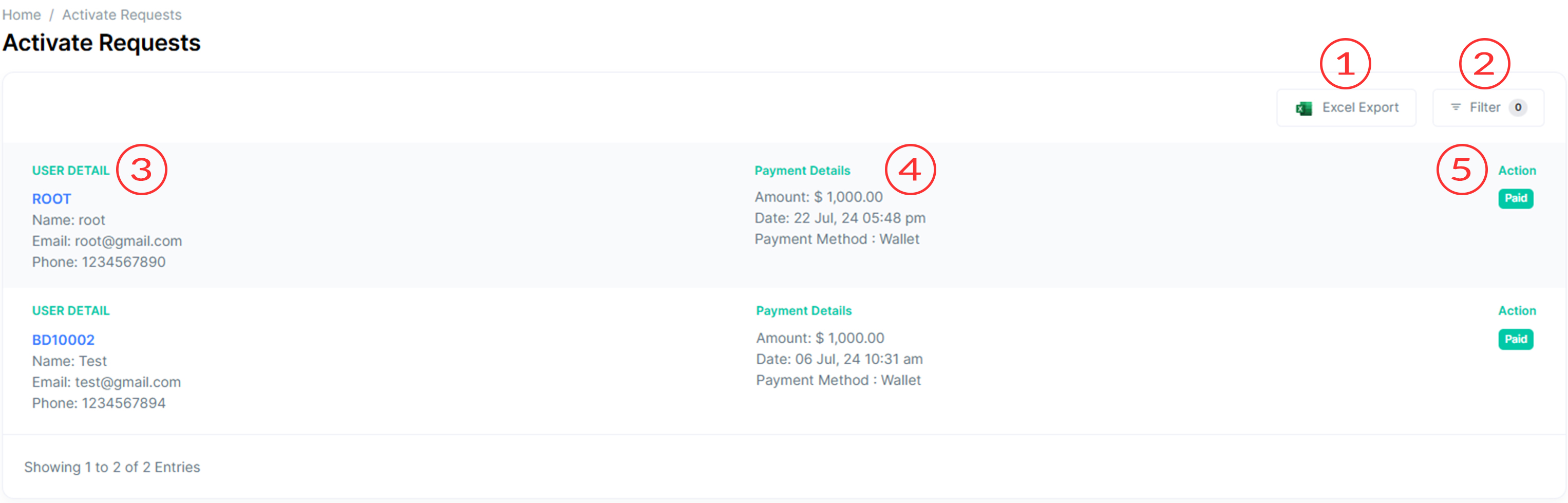 This section shows the details of the payment made by the user. It includes amount of package, date and time when the payment was made and the method used for payment.