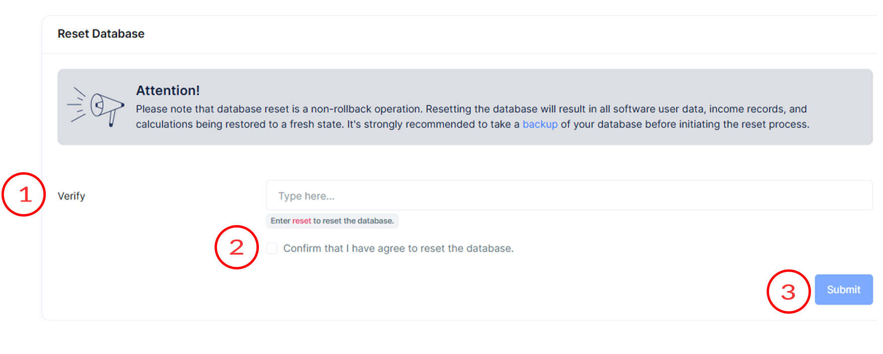 Clicking this button will initiate the database reset process. Ensure that you have typed the keyword correctly and checked the confirmation box before submitting.