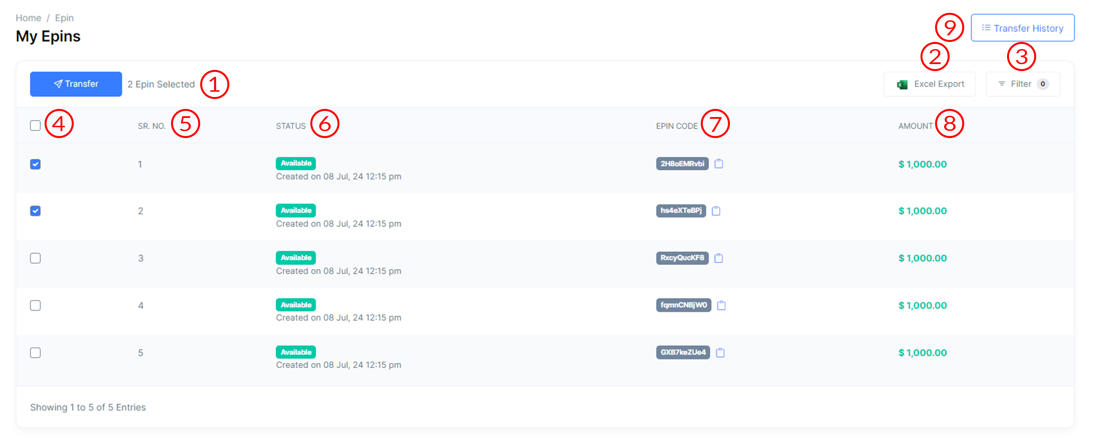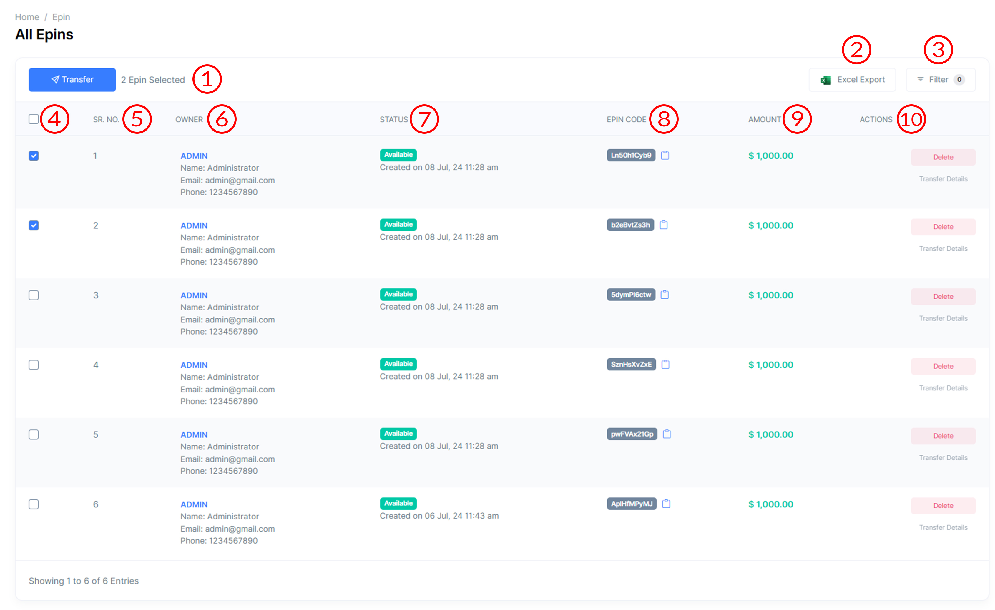 This column provides action buttons for each Epin. The available action here is "Delete," which allows the user to remove the Epin. There's also an option to view "Transfer Details" for each Epin.