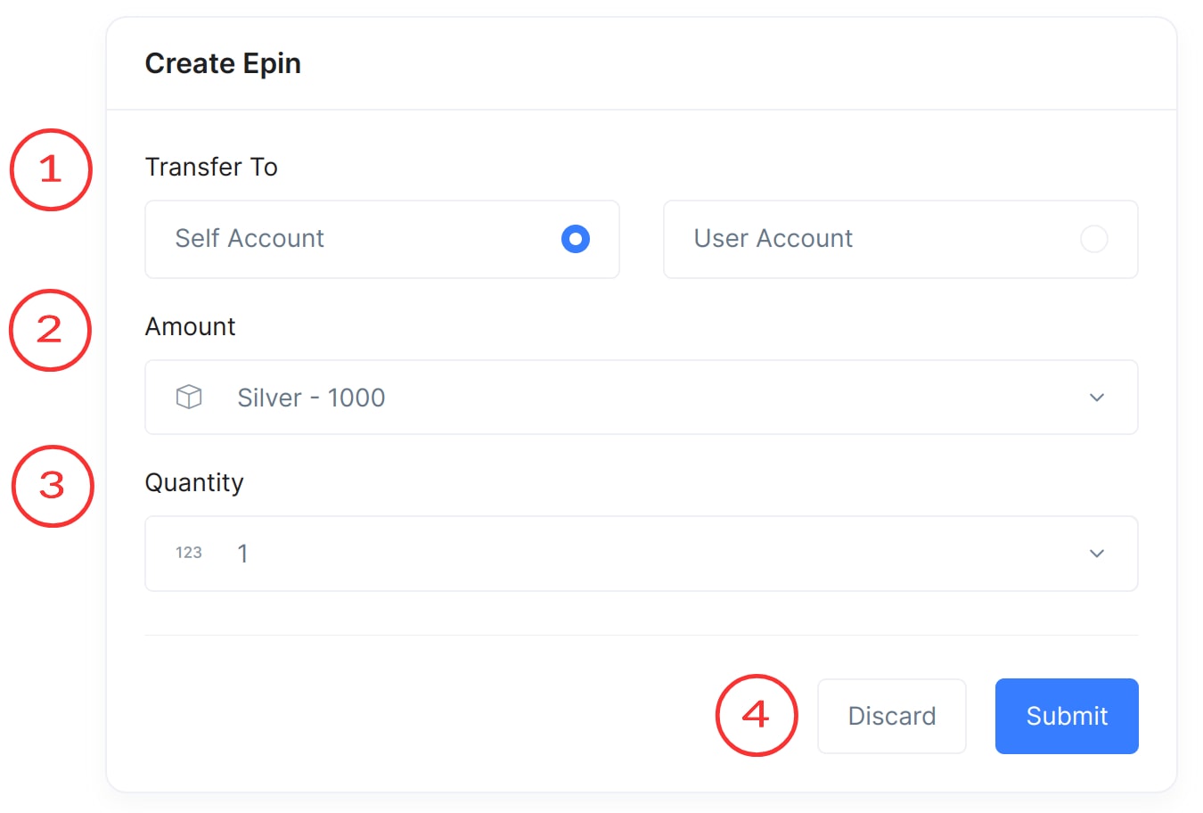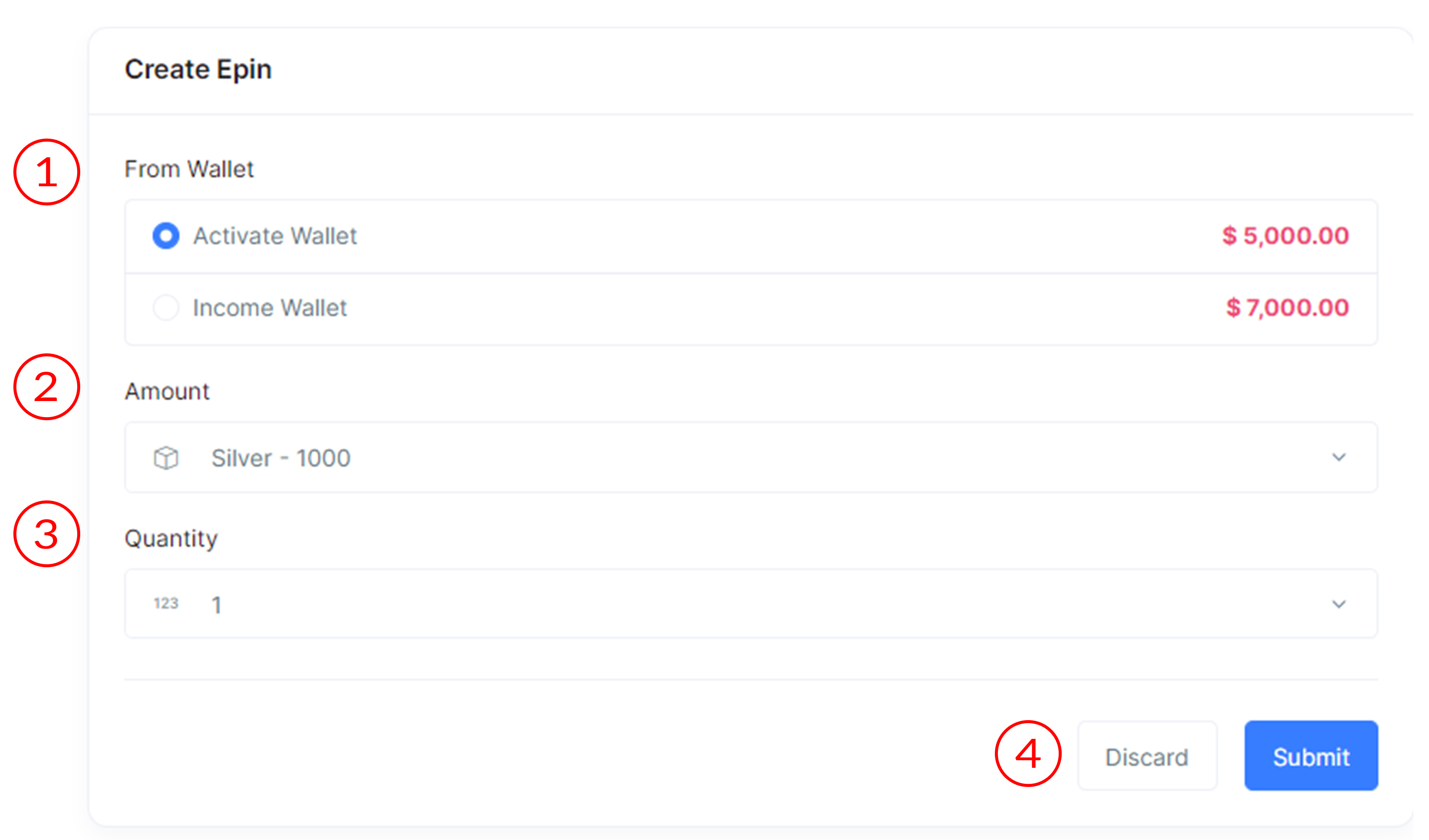 Amount select option (e.g., 1000, 2000, 3000) to create Epin of that particular amount.