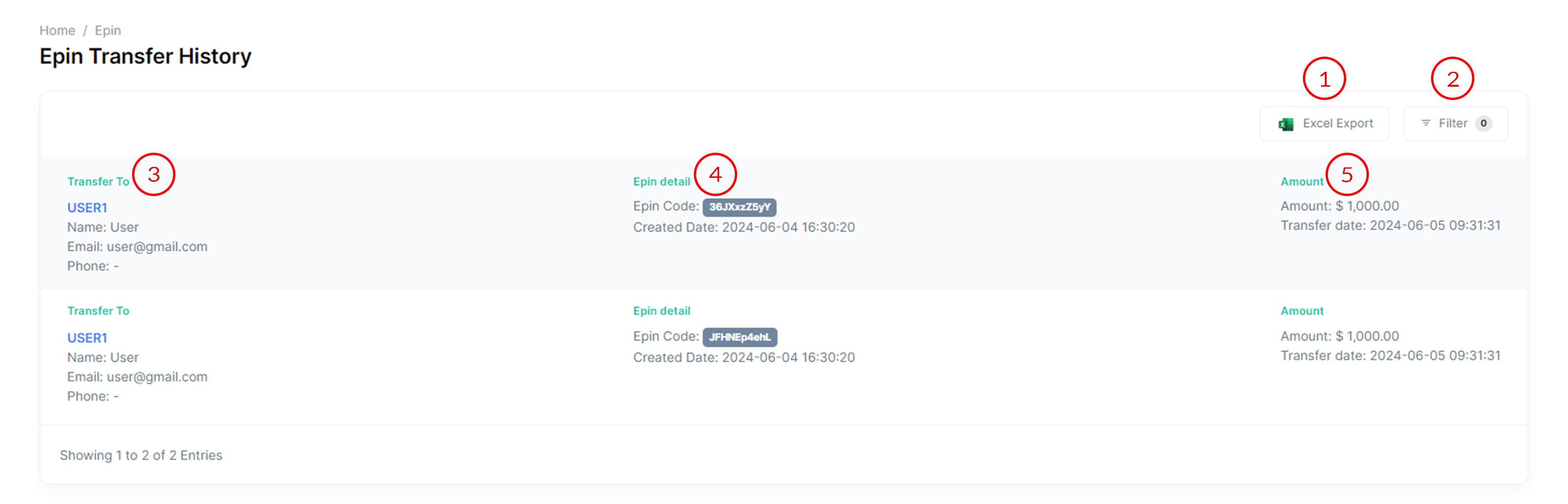 The User My Epins page allows users to view and manage their created Epins in MLM Software.