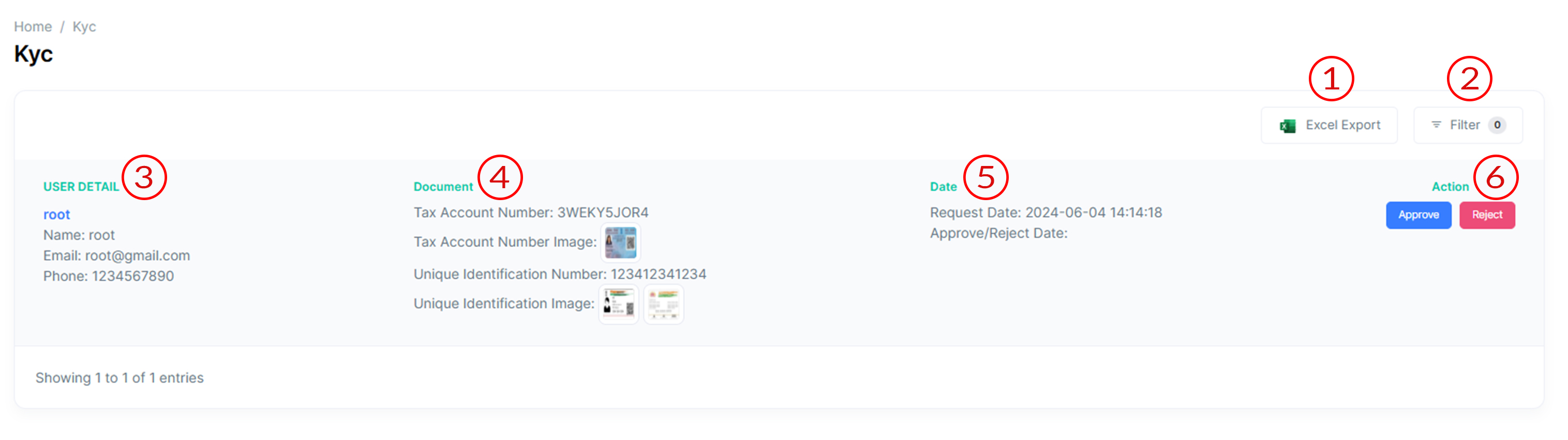 KYC Verification Approve/Reject page provides functionalities for managing user KYC submissions.