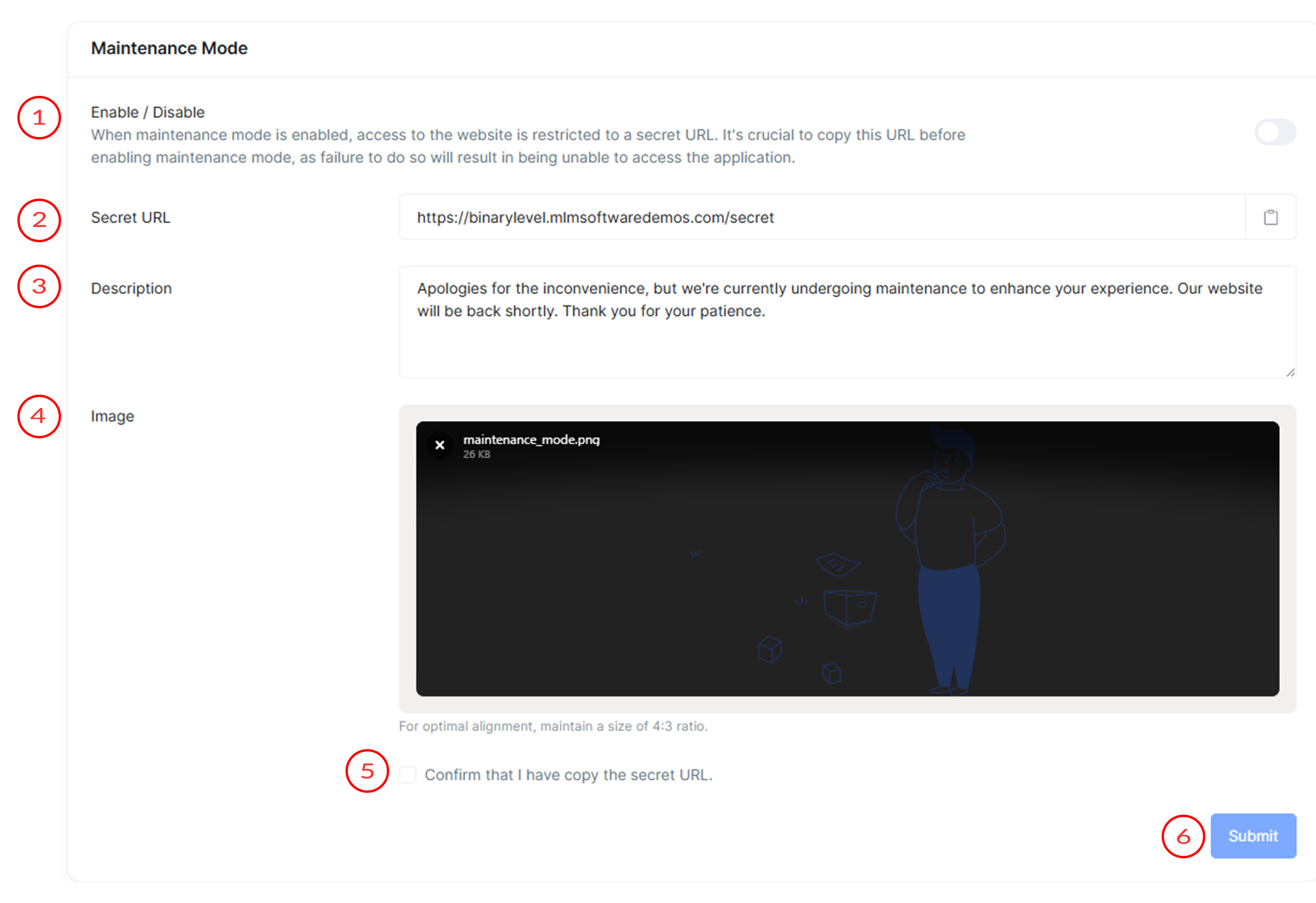 This section allows the user to upload an image that will be displayed on the maintenance page.