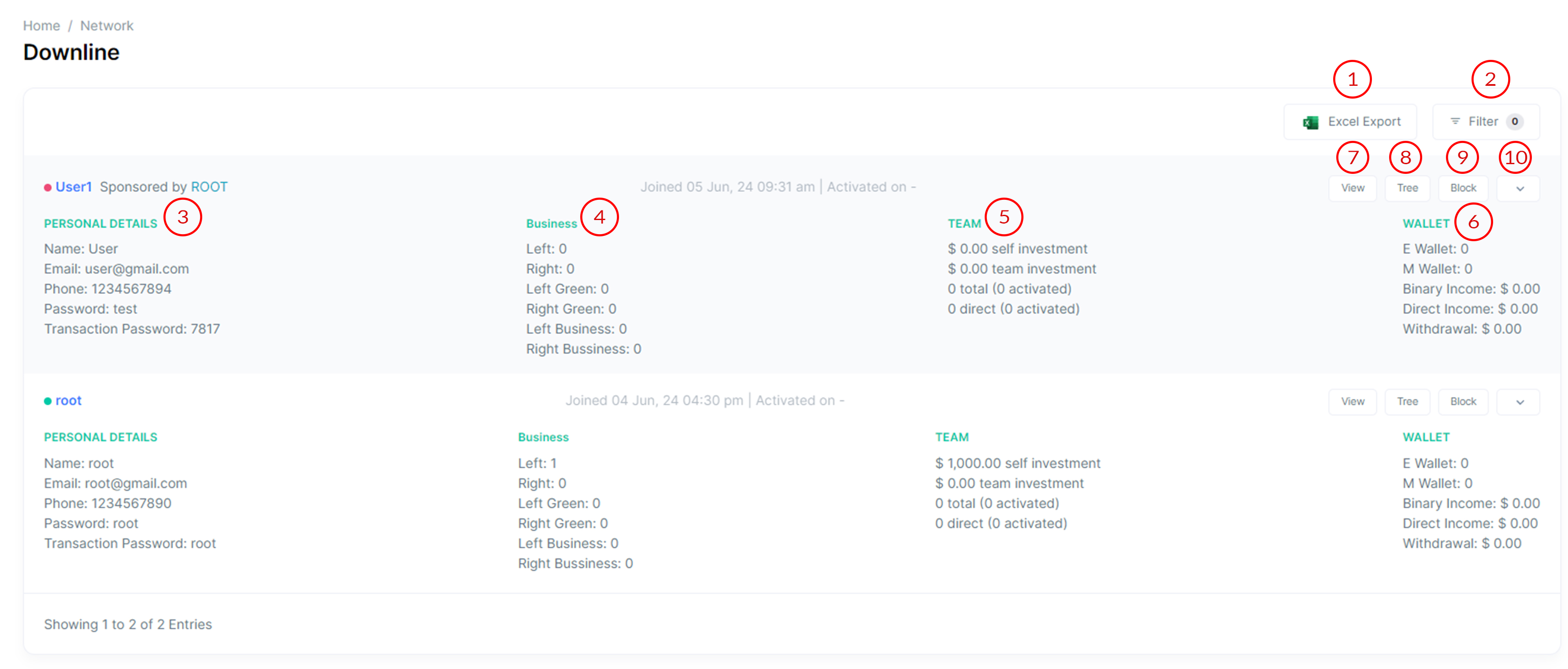 In the left and right counts in the binary tree are presented, representing individuals who have registered under the user's sponsorship. This section also includes Left Green and Right Green counts, indicating active users on both sides of the binary tree. Further details in the Business section encompass Left Business and Right Business earnings, providing insights into the financial performance associated with each leg of the binary tree.