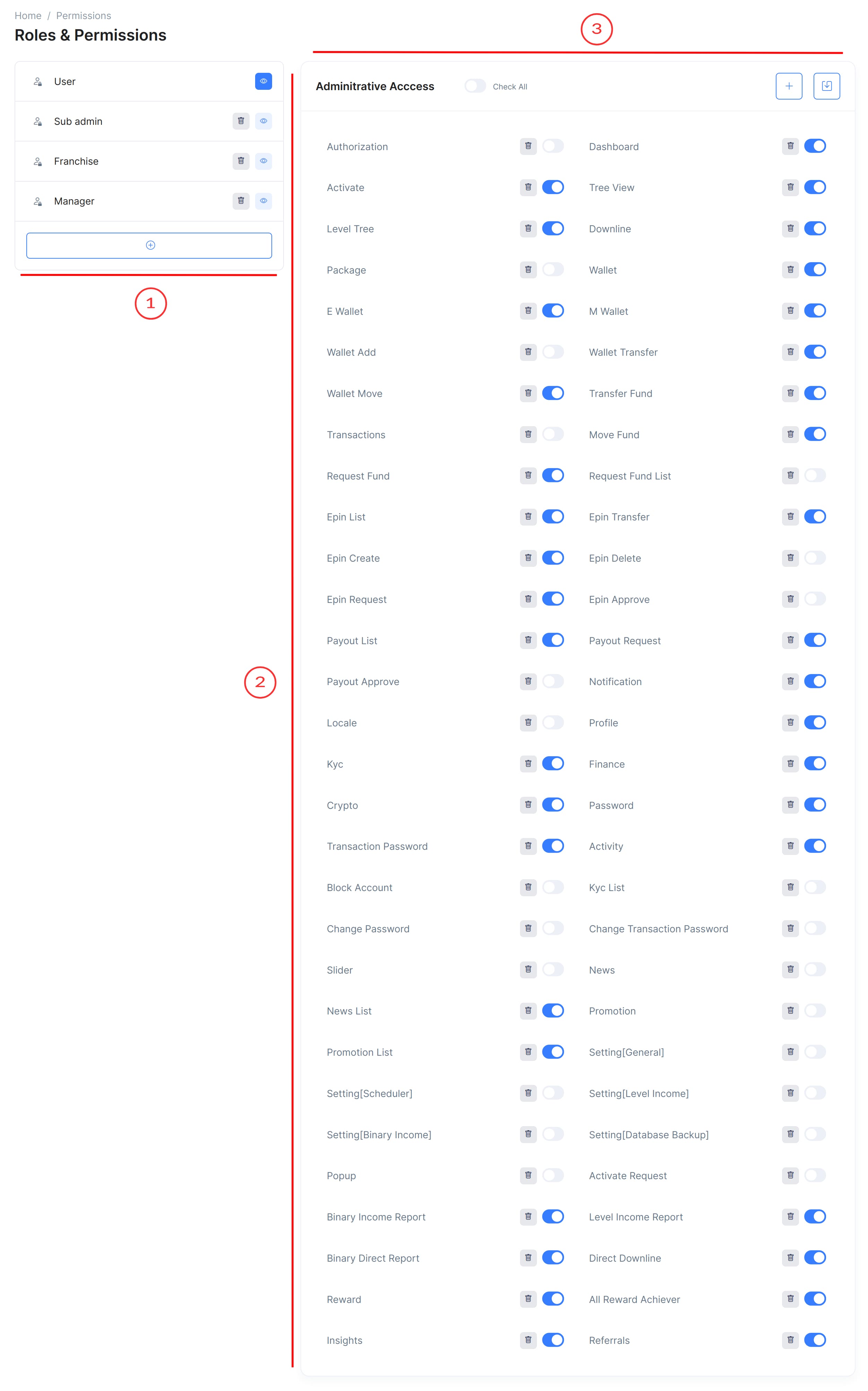 - Provide toggle switches for each permission to enable or disable them for any role.