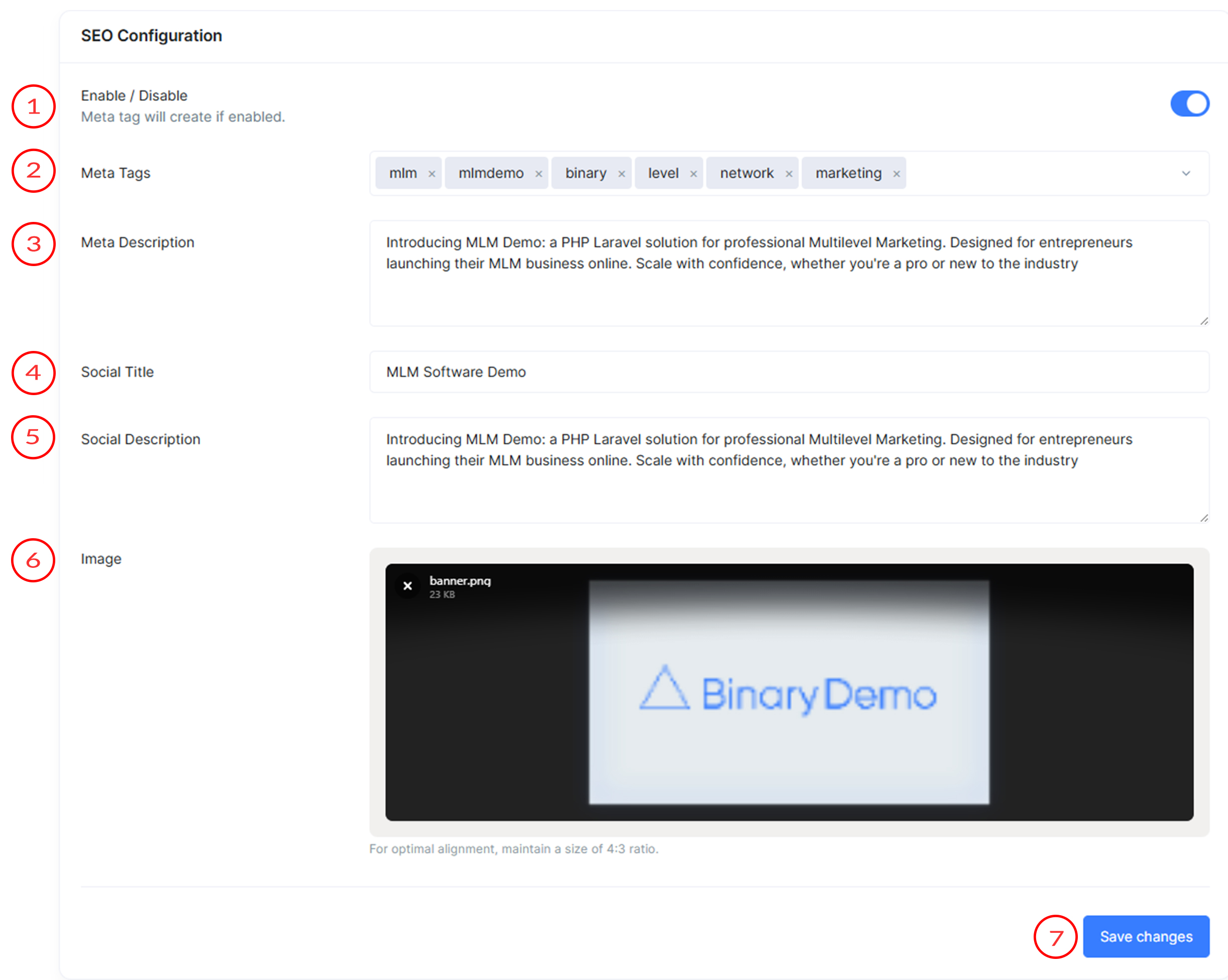 This button is used to save the SEO configuration settings. After making changes to any of the fields, the user can click this button to apply and save the settings.