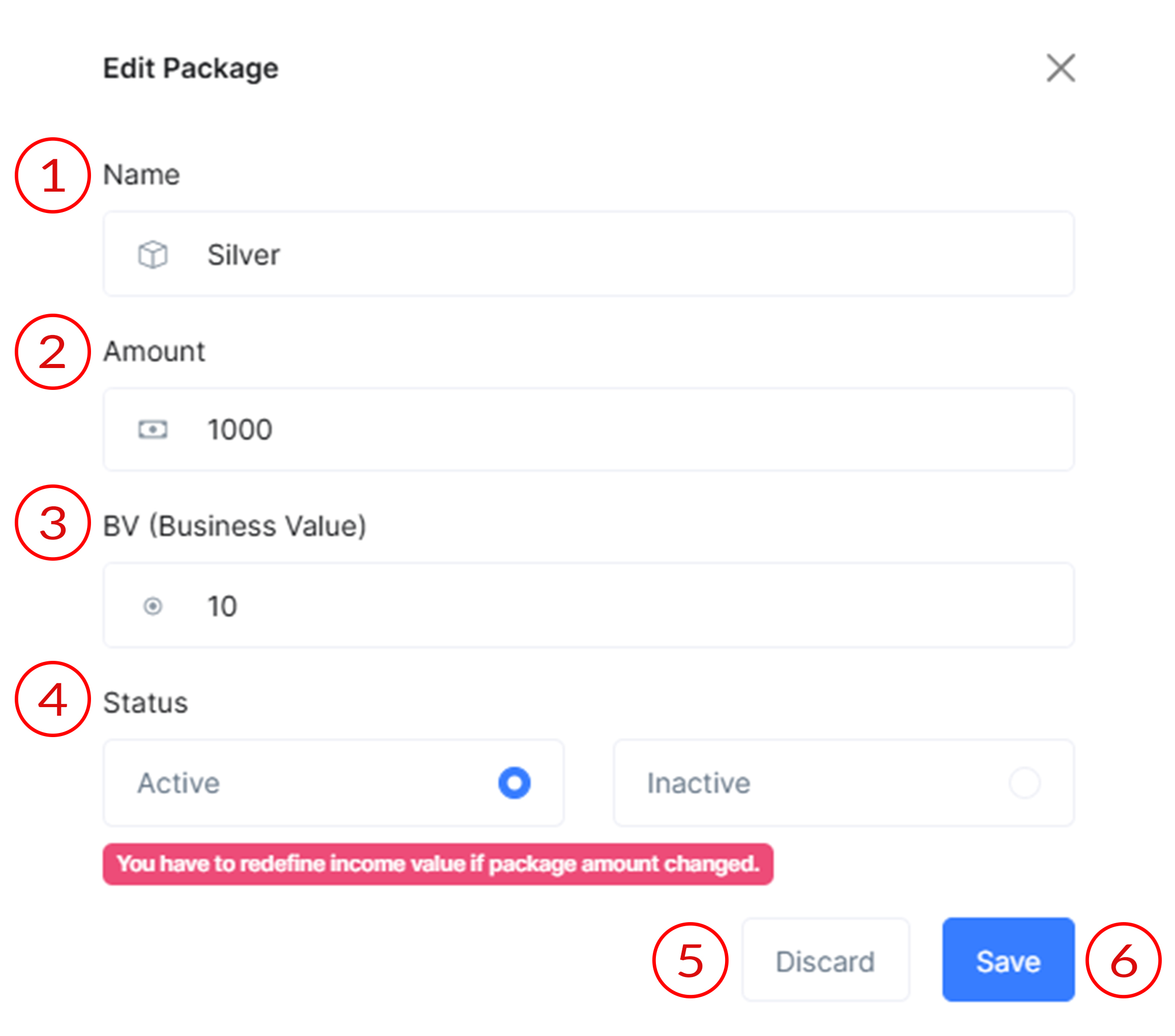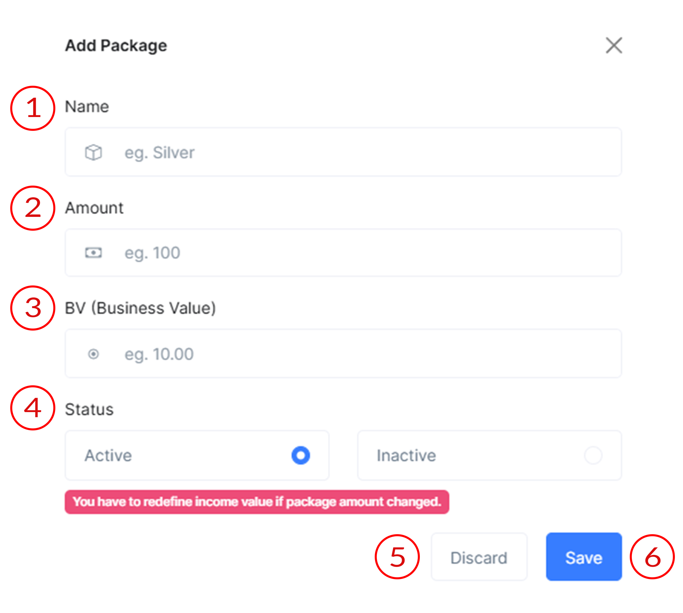 This field is used to input the Business Volume (BV) points associated with the package. BV points are crucial for calculating commissions and bonuses within the MLM structure.