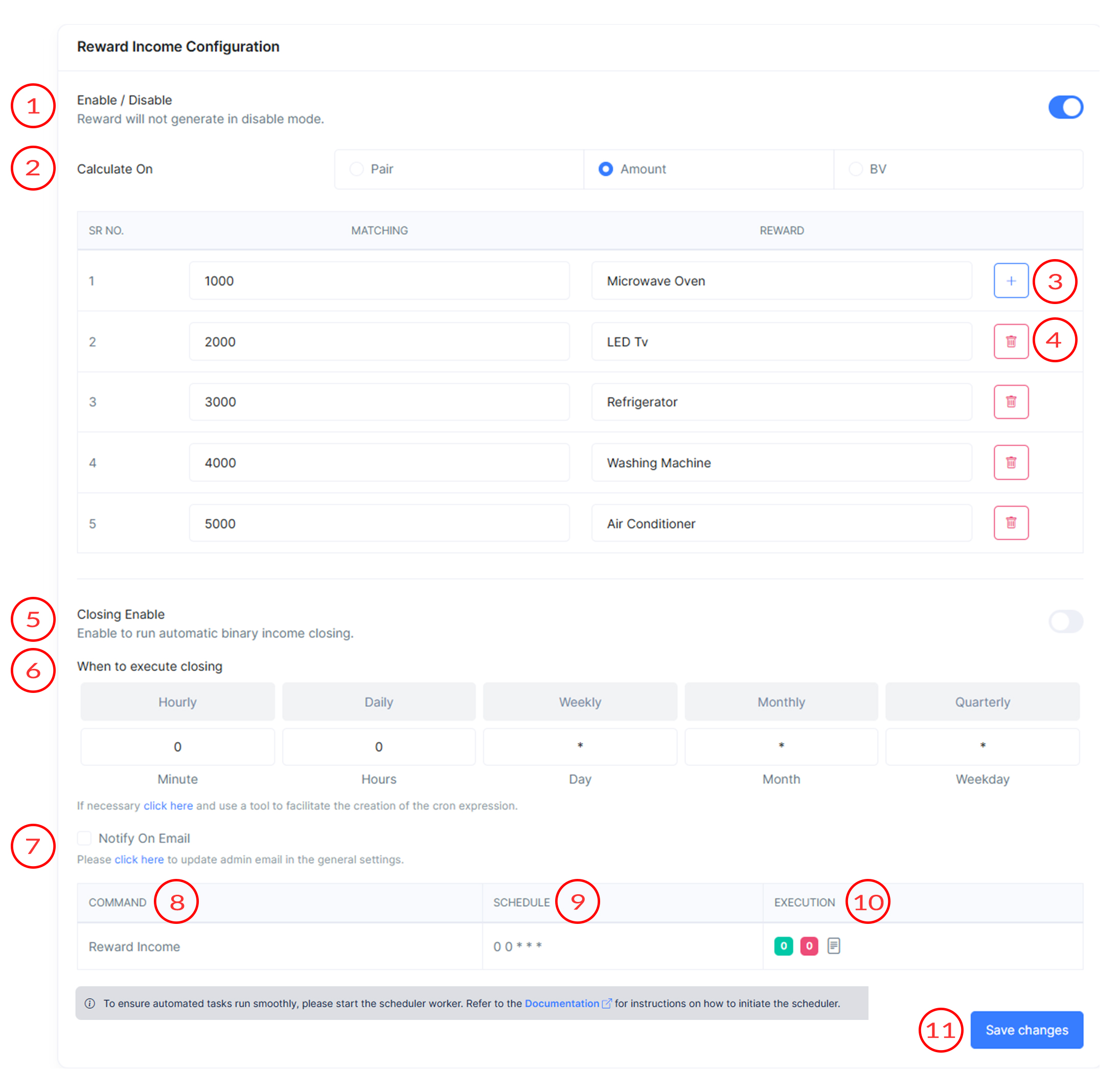 Enable this feature to automate reward income closing. This option allows you to set a schedule for when the reward income should be automatically generate (e.g., hourly, daily, weekly, monthly, or quarterly).