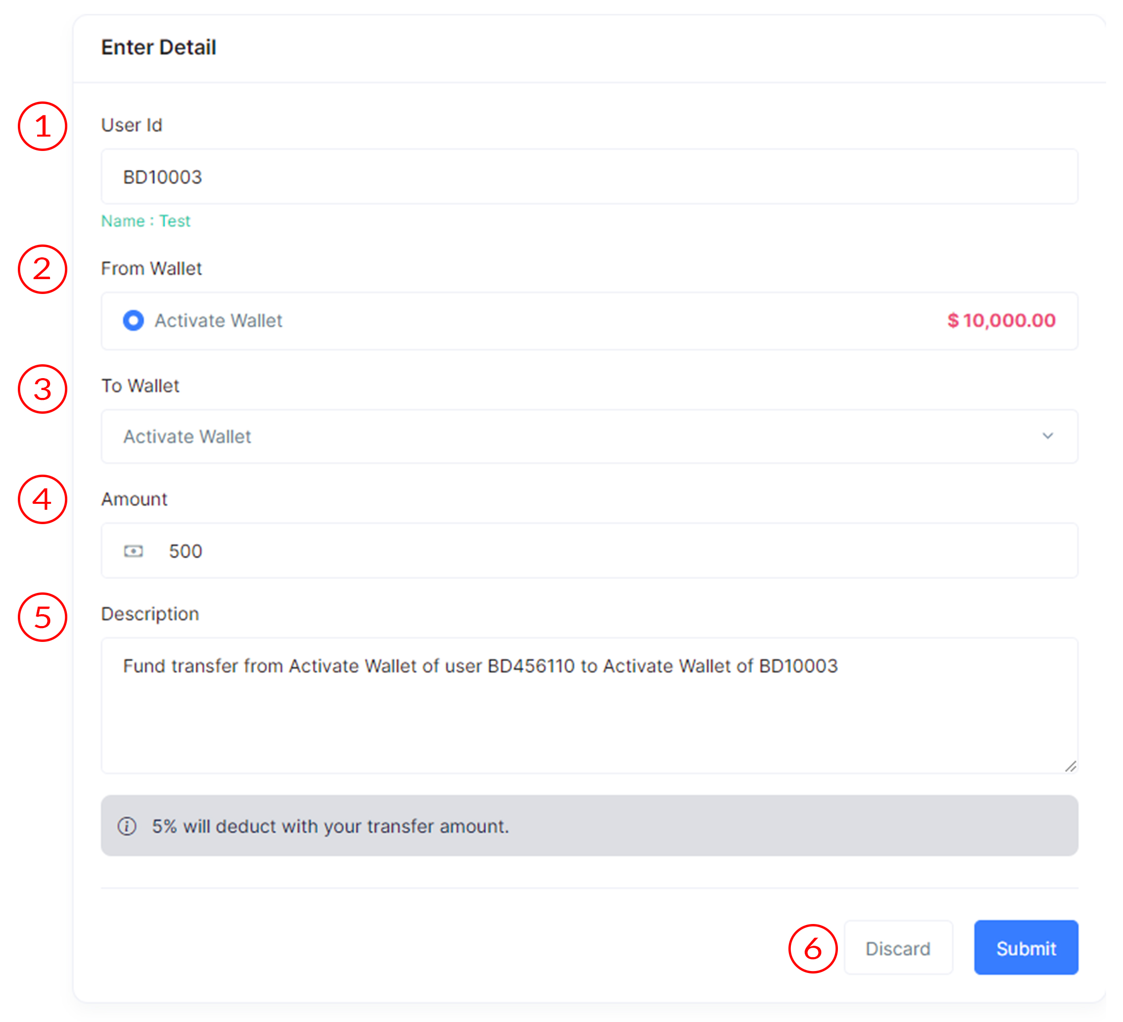 The Transfer Fund page allows users to transfer funds between user wallets in MLM Software.